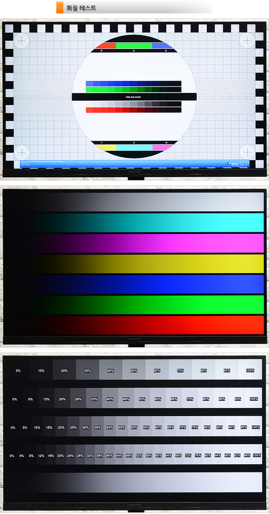 스마트폰을 사용하면 플리커 현상을 확인할 수 있다. (전문가 모드에서 셔터스피드 1/300 이상으로 셋팅) 테스트용 모니터는 플리커 현상이 발생하는데 반해 크로스오버 32UCA950는 플리커 현상 없이 깔끔한 영상을 구현하는 것을 확인할 수 있었다. (동영상을 통해 자세히 확인하기 바란다.)