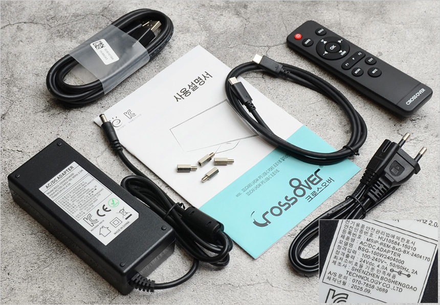 액세서리의 모습으로 PD충전을 위한 96W 전원 어댑터와 전원 케이블, DP & C타입 케이블이 제공되며 사용설명서, 리모콘과 베사 연장볼트가 포함된 것을 확인할 수 있다.