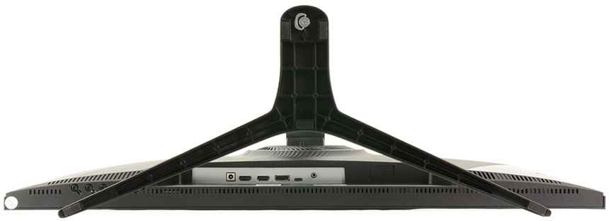 후면 중앙에는 75mm 베사홀이 설치되어 벽에 걸거나 ARM 등에 장착해 사용할 수 있으며 (툴리스 방식의 받침대를 지원해 손쉽게 탈착할 수 있다.) 베사 연장볼트를 제공해 설치 편의성을 높였다. 또한 하단 중앙에는 DP 1.4 단자와 두 개의 HDMI 2.0 단자를 지원해 PC는 물론 게임콘솔이나 IPTV, OTT 플레이어 등을 손쉽게 연결할 수 있으며 스마트폰이나 노트북 연결을 위한 C타입 단자도 제공된다. (PD충전 지원으로 연결과 동시에 디바이스가 충전된다.)