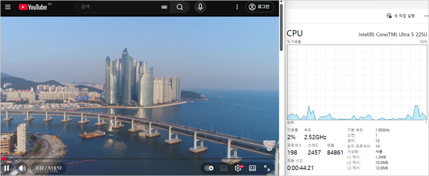 유튜브 고화질 영상을 플레이 하고 (2160P@60FPS로 설정) CPU 점유율을 확인하고 있는 모습으로 2~13% 로 변화했으며 인터넷을 함께 실행했을 때 순간적으로 20% 후반까지 점유율이 올라갔으며 끊킴등은 발생하지 않았다.