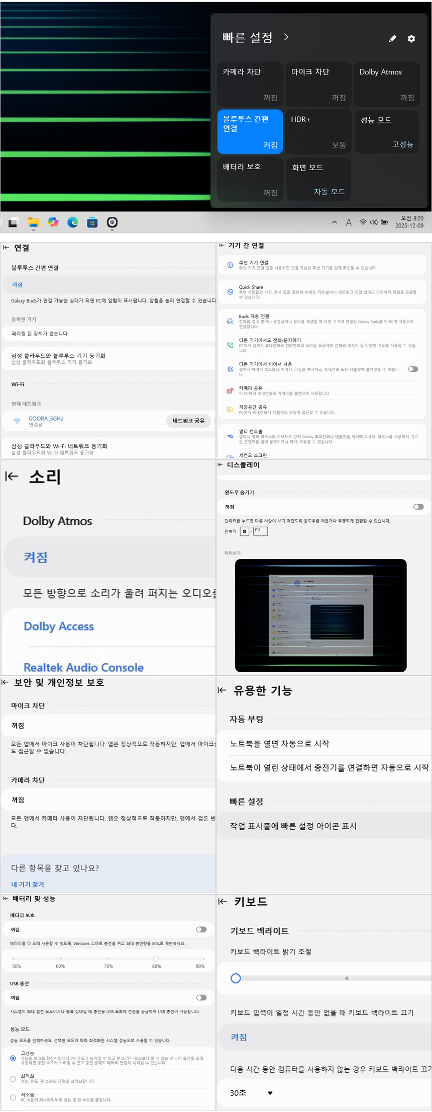 삼성 Settings를 실행한 모습으로 (Fn+F1 단축키 제공) 빠른 설정을 지원해 편의성을 높였으며 메인 메뉴에서는 블루투스 연결과 사운드 & 디스플레이 설정이 가능하다. (디스플레이 메뉴에서 사생활 침해를 방지할 수 있는 윈도우 숨기기 기능이 추가되었다.) 또한 퍼포먼스 설정과 키보드 백라이트 설정 등을 지원한다. (자세한 사항은 동영상을 참조하기 바란다.)