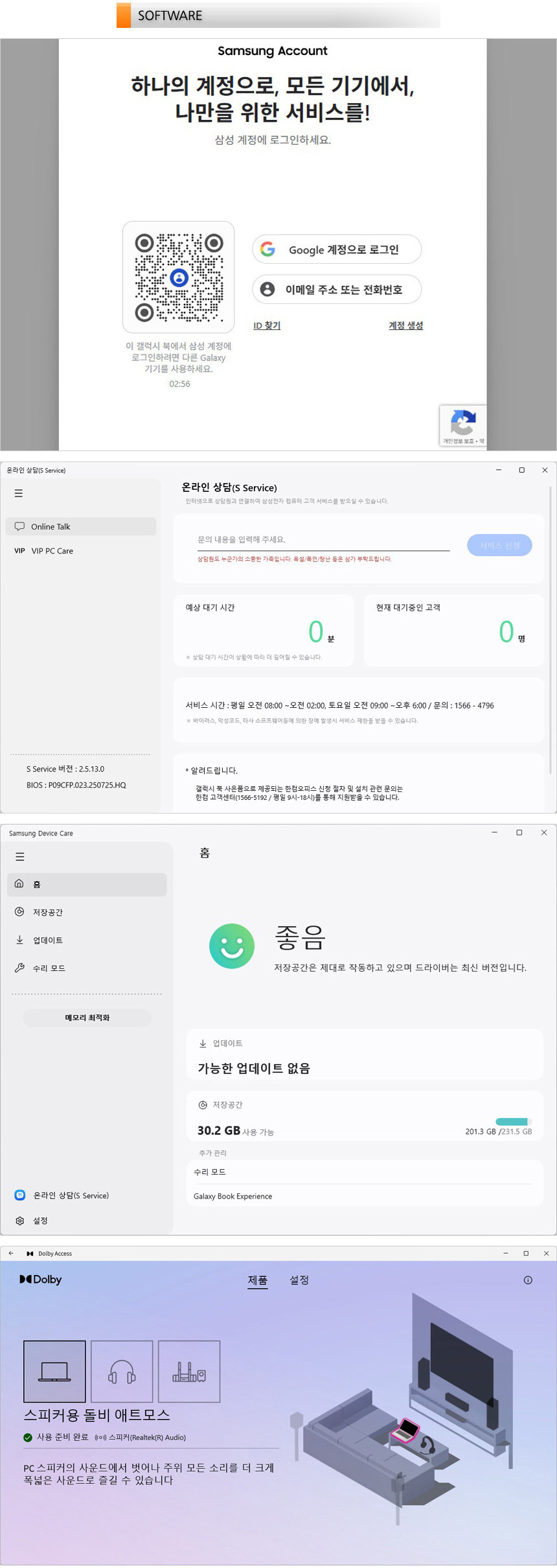 기본 지원하는 앱중 일부는 삼성 계정을 등록해야 사용이 가능하다. 삼성 갤럭시북은 사용자의 불편을 최소화 하기 위해 삼성 어카운트에서 QR코드 로그인을 제공하며 삼성 디바이스 케어를 통해 노트북을 손쉽게 관리할 수 있다. (기본 제공되는 S/W가 아주 많다. 필요한 S/W 는 갤럭시북 익스피리언스에서 설치하기 바란다.) 뿐만 아니라 온라인 상담을 지원해 노트북에 문제가 발생했을 때 빠르게 조치를 받을 수 있으며 돌비 애트모스 지원으로 사용자에 맞는 최적의 음색을 설정할 수 있다.