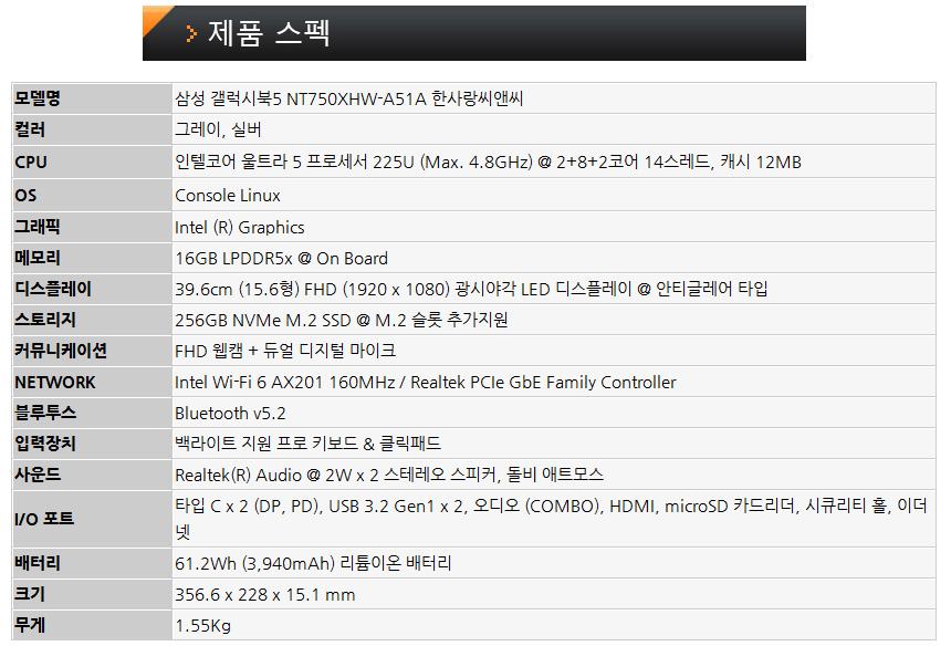 이번에 리뷰를 진행 할 삼성 갤럭시북5 NT750XHW-A51A 는 삼성 공식 파트너사인 한사랑씨앤씨에서 출시한 고급형 노트북으로 인텔코어 울트라 5 프로세서 225U와 16GB 메모리 조합으로 문서작업이나 웹서핑은 물론 디자인, 영상편집 등 높은 성능을 필요로 하는 작업도 원활하게 실행할 수 있다. 그럼에도 불구하고 100만원 초반대의 합리적인 가격으로 출시해 비용 부담을 최소화 했다.