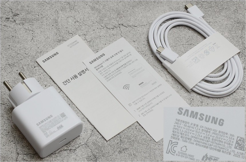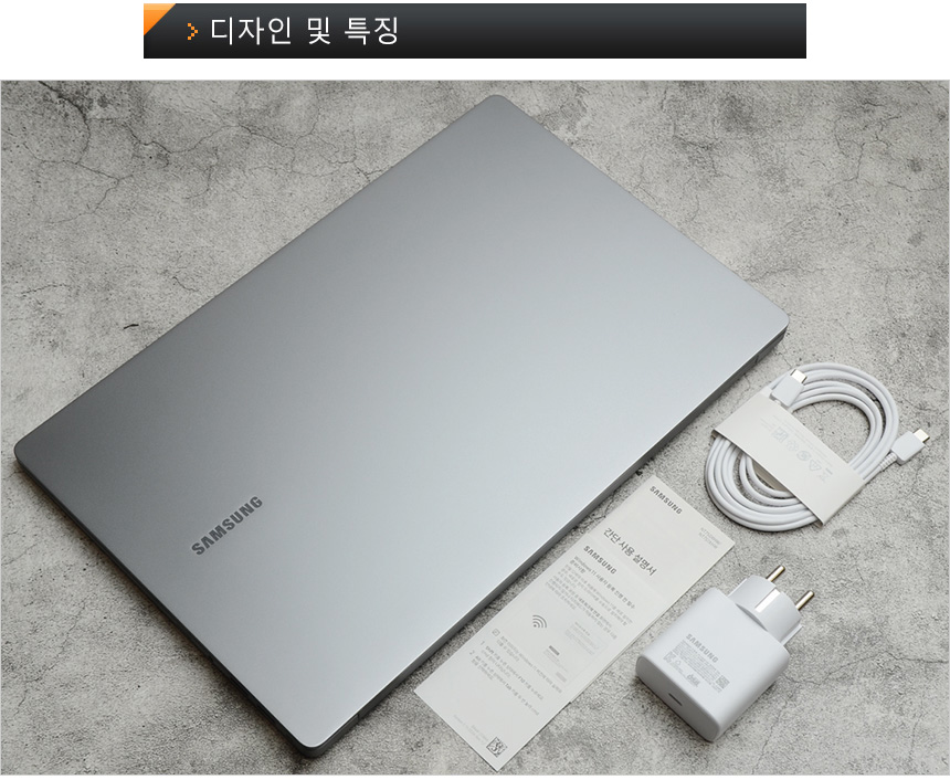 기본 제공되는 액세서리의 모습으로 작은 크기로 휴대성을 높인 45W 전원 어댑터와 케이블, 퀵 매뉴얼이 포함되어 있다. (전원 어댑터는 다양한 전압을 지원해 스마트폰이나 태블릿PC 충전기로도 활용할 수 있다.)