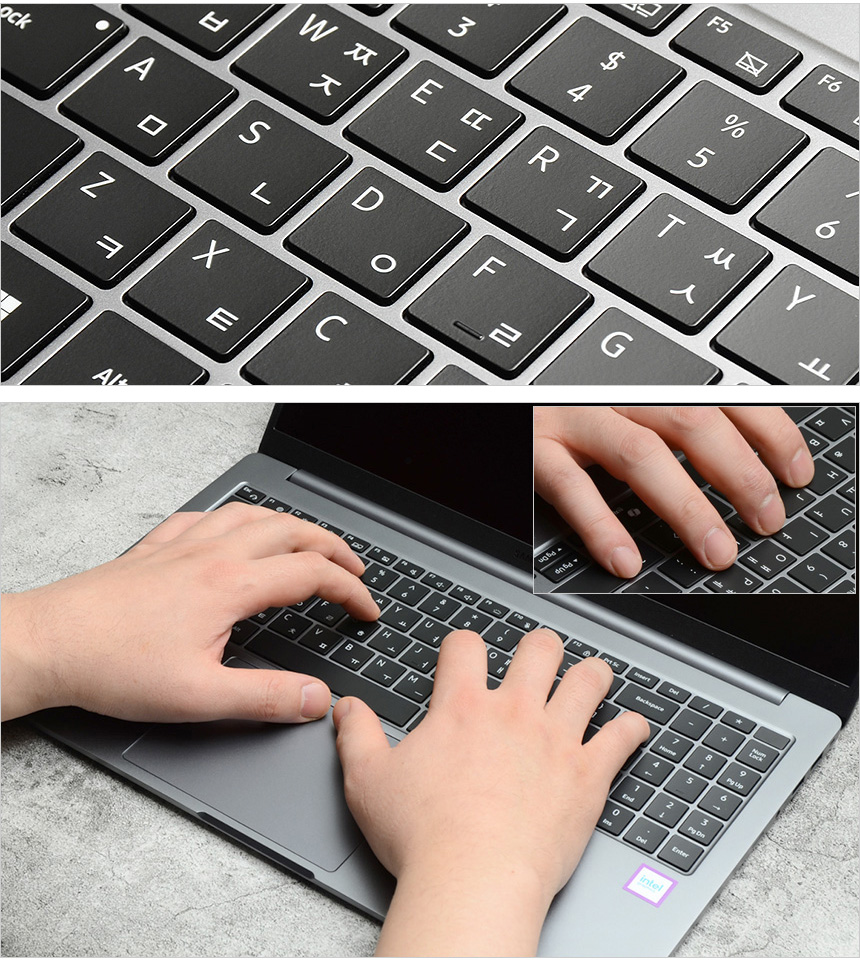 타이핑 테스트를 진행하고 있는 모습으로 넓은 키간격으로 오타없는 고속 타이핑이 가능했으며 키소음이 거의 발생하지 않아 정숙을 요하는 강의실 등에서 편하게 사용할 수 있다. 또한 대화면 노트북 답게 팜래스트가 손을 완전히 받쳐주어 장시간 타이핑시에도 손목등의 피로감이 크지 않았으며 가벼운 키감으로 장시간 타이핑에서도 피로감이 크지 않았다.