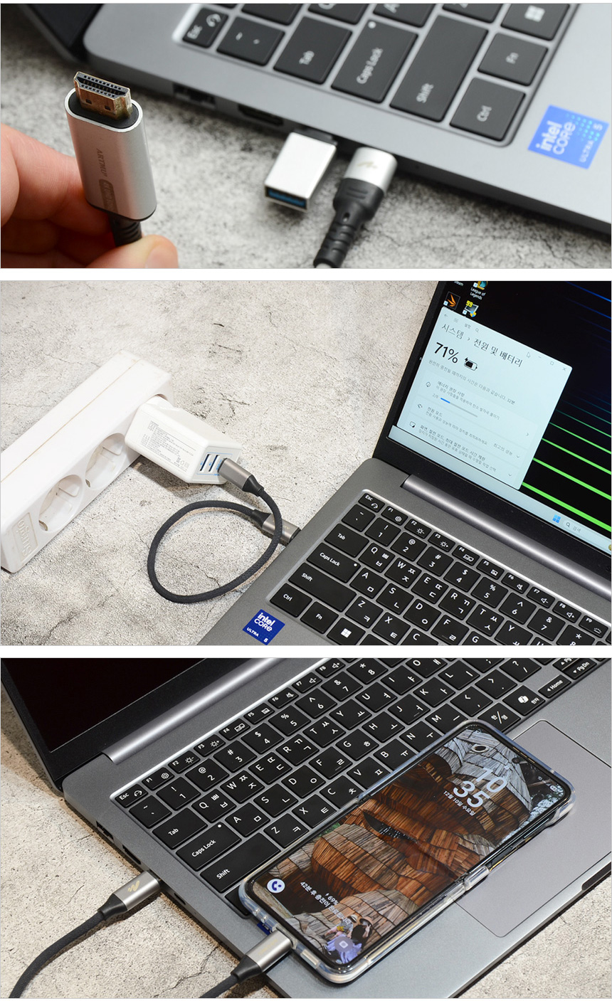 C타입 단자는 디스플레이 출력을 지원해 HDMI 와 함께 모니터를 연결할 수 있으며 젠더를 사용해 A타입의 일반 주변기기도 연결할 수 있다. PD 충전기나 고속충전 보조배터리 등을 연결해 전원을 공급할 수 있으며 상시전원을 지원해 노트북이 꺼진 상태에서도 스마트폰 충전용으로 활용할 수 있다.