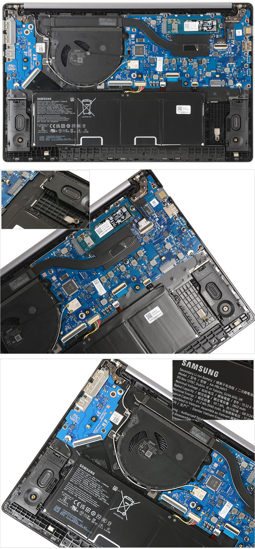 노트북 내부의 모습으로 상단에 팬과 히트파이프가 설치되어 CPU에서 발생하는 열을 식혀주며 하단에는 3940mAh 용량의 리튬이온 배터리와 스피커 등이 장착된 것을 확인할 수 있다.