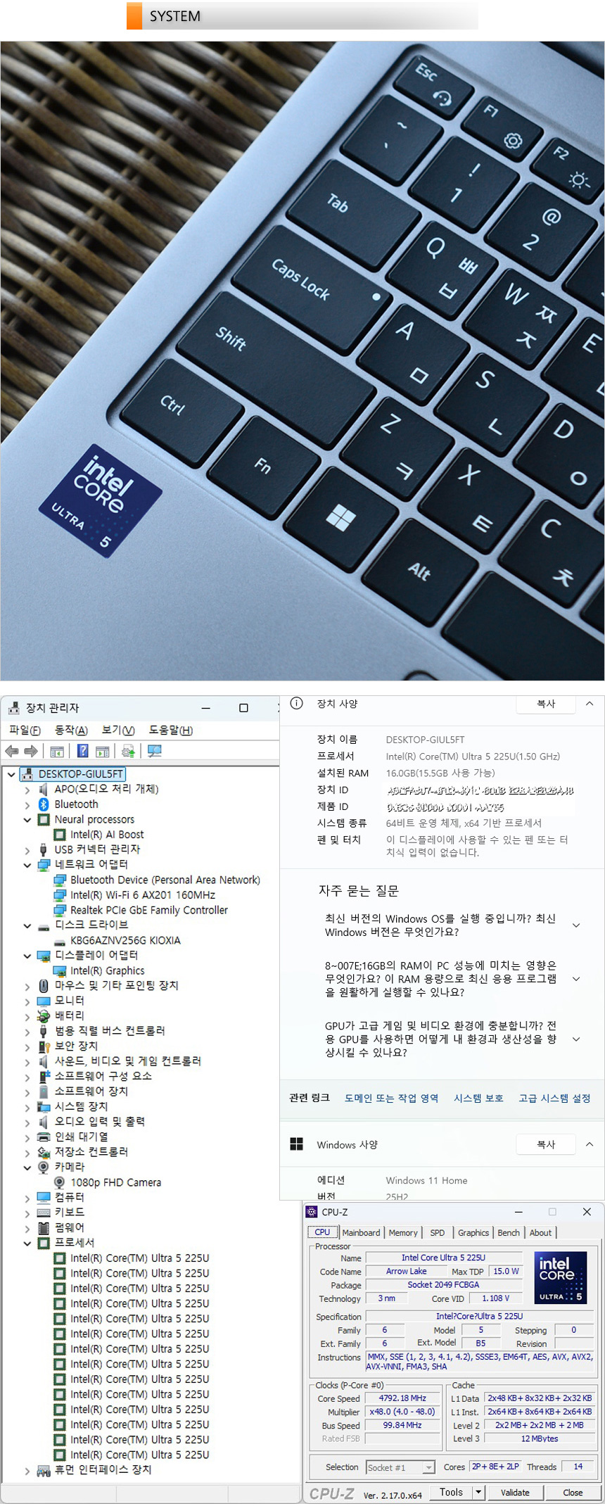 시스템 정보를 확인하고 있는 모습으로 2개의 성능코어와 8개의 효율코어, 2개의 초저전력 코어를 지원하고 최대 4.8Ghz 클럭으로 작동하는 15W 저전력 인텔코어 울트라 5 225U 프로세서가 장착된 것을 확인할 수 있다. 또한 8GB 용량을 지원하는 경쟁 모델들과 달리 작업도 부드럽게 실행할 수 있도록 16GB LPDDR5x 메모리를 탑재했으며 인텔 (R) 내장그래픽을 장착해 캐주얼한 게임 정도는 부드럽게 실행할 수 있다.