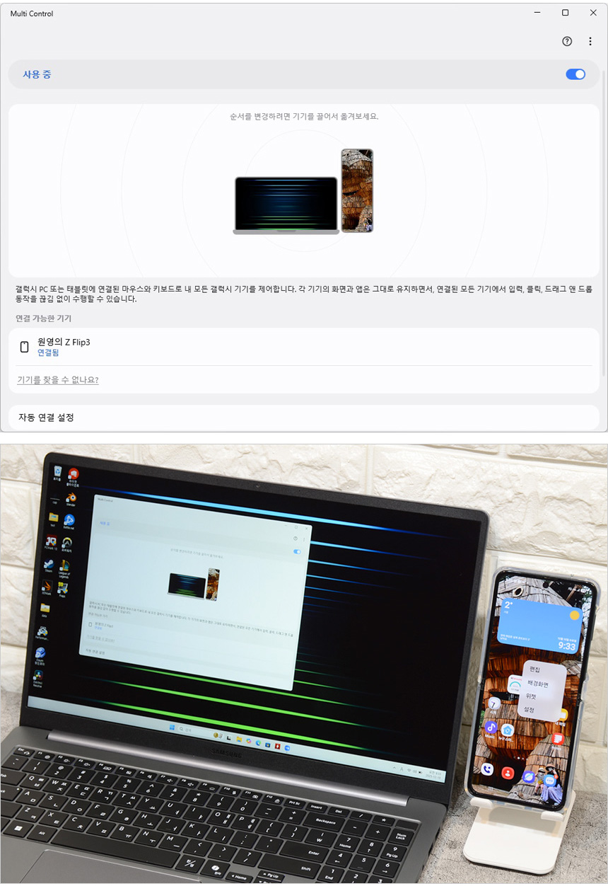노트북 키보드와 터치패드 (연결된 마우스 포함) 를 스마트폰과 공유할 수 있는 멀티 컨트롤을 지원한다. 상단의 사진은 멀티 컨트롤을 테스트 하고 있는 모습으로 듀얼 모니터를 사용한 듯 자연스럽게 마우스 커서가 이동하는 것을 확인할 수 있었다. (KVM 과 달리 디바이스 변경을 위한 단축키도 누를 필요가 없다.) 텍스트 등을 복사에 기기간 붙여넣기도 할 수 있어 유용하게 활용할 수 있을 것이다.