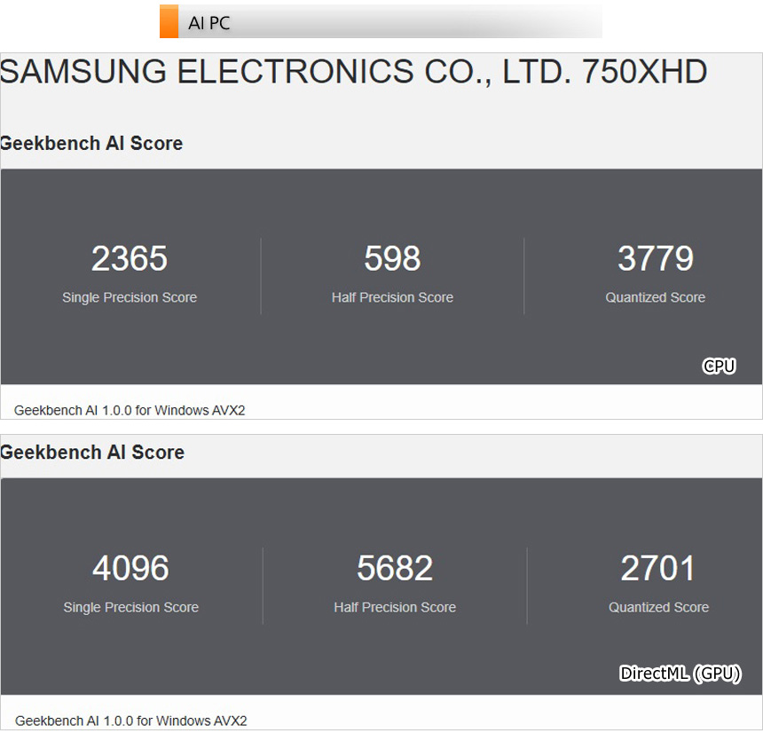 AI 전용 벤치마크 툴을 이용해 AI 성능 테스트를 진행하고 있는 모습으로 생성형 AI도 부드럽게 사용할 수 있는 높은 스코어를 보여주었다. (팬티엄 등의 CPU를 탑재한 모델들과는 확연히 다른 성능을 제공한다.)