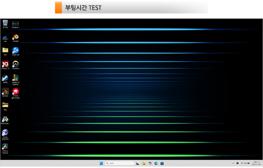 노트북이 완전히 꺼진 상태에서 전원 버튼을 눌러 바탕화면이 나올때 까지의 시간을 측정했는데 11.5초가 소요되는 것을 확인할 수 있었다. 기다림의 지루함 없이 노트북을 사용할 수 있을 것이다.