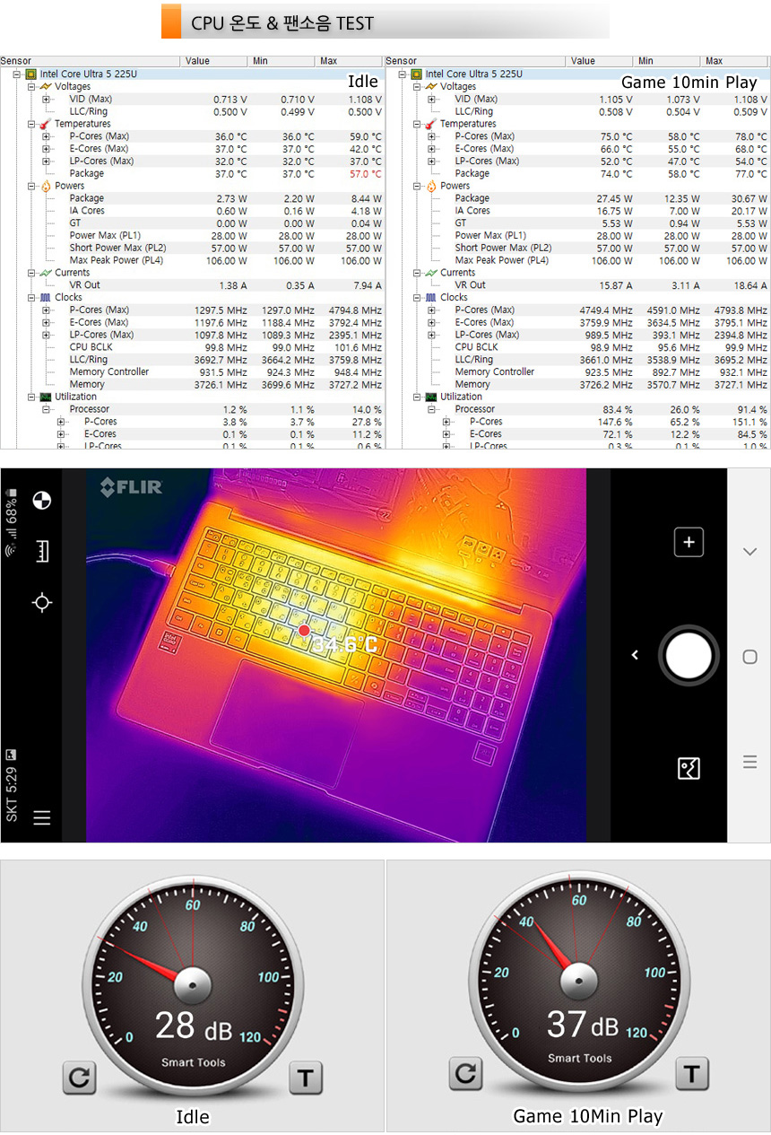 CPU 온도 테스트를 진행하고 있는 모습으로 (최고성능 모드, 실내온도 15도) Idle 상태에서는 30도 중반으로 동작했으며 오버워치 2를 10분 정도 플레이 했을 때 70도 후반까지 온도가 올라가는 것을 확인할 수 있었다. 또한 열화상 카메라를 이용해 게임 실행중 열분포를 확인해 보았는데 CPU가 설치된 키보드 중앙부를 중심으로 열이 퍼져나가며 열이 빠져 나가는 통풍구 부분의 온도가 높은 것을 확인할 수 있다. 팜래스트의 온도는 상당히 낮아 열로 인한 스트레스 없이 손을 올려두고 사용할 수 있다. (좌측 팜래스트는 손을 올려두고 게임을 실행해 열이 발생한 것이다.)