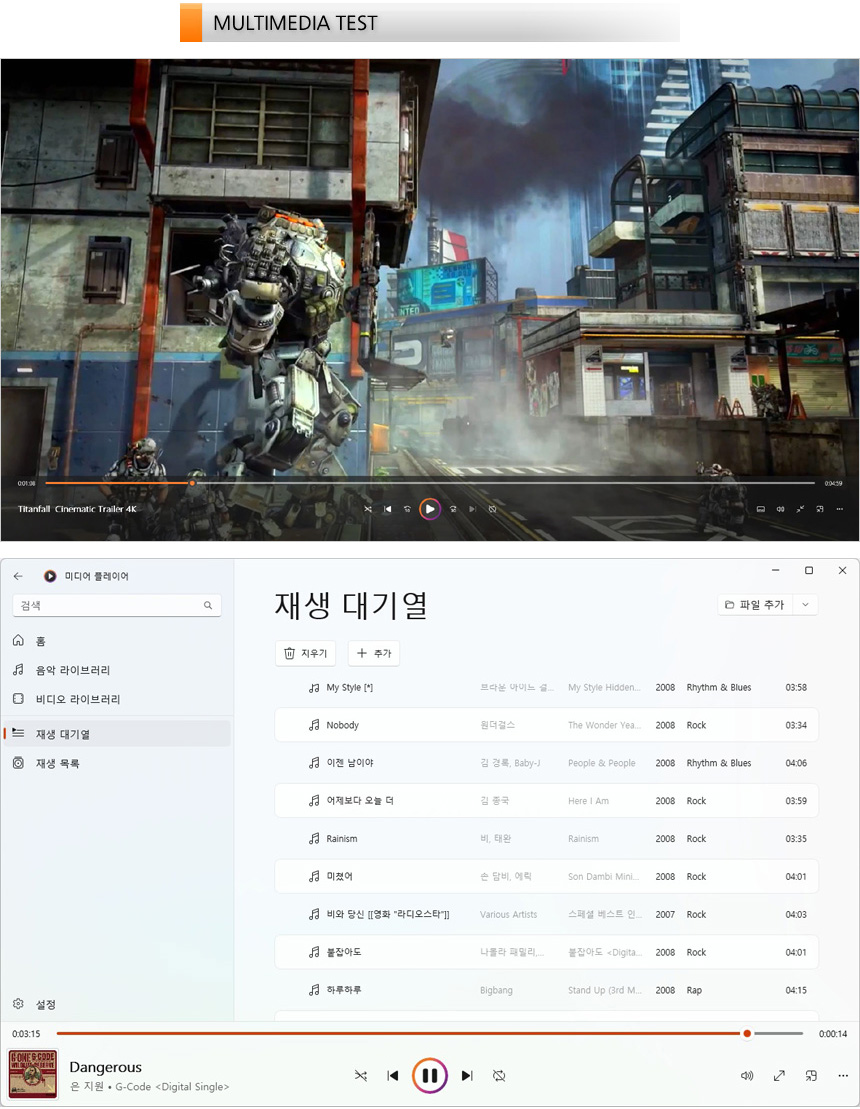 4K 동영상을 이용해 멀티미디어 테스트를 진행하고 있는 모습으로 밝고 선명한 영상을 즐길 수 있었다. (프로 시리즈 수준은 아니지만 실내에서는 사용하는데 전혀 불편이 없는 선명함을 보여주었다.) 또한 돌비 애트모스도 지원해 경쟁 모델과 비교되는 퀄리티 높은 사운드를 들려 주었다.