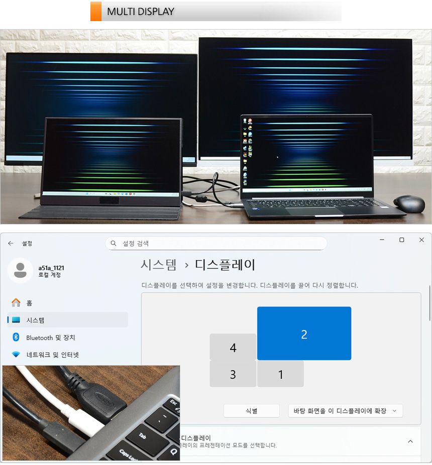 2개의 C타입 단자가 디스플레이 출력을 지원해 프리미엄 노트북과 같이 3개의 모니터를 연결해 사용할 수 있다. (HDMI 포함) 상단의 사진은 모니터를 연결한 모습으로 4K 모니터도 정상적으로 인식하는 것을 확인할 수 있었다. 멀티테스킹이 많은 환경에서도 원활하게 사용할 수 있을 것이다.