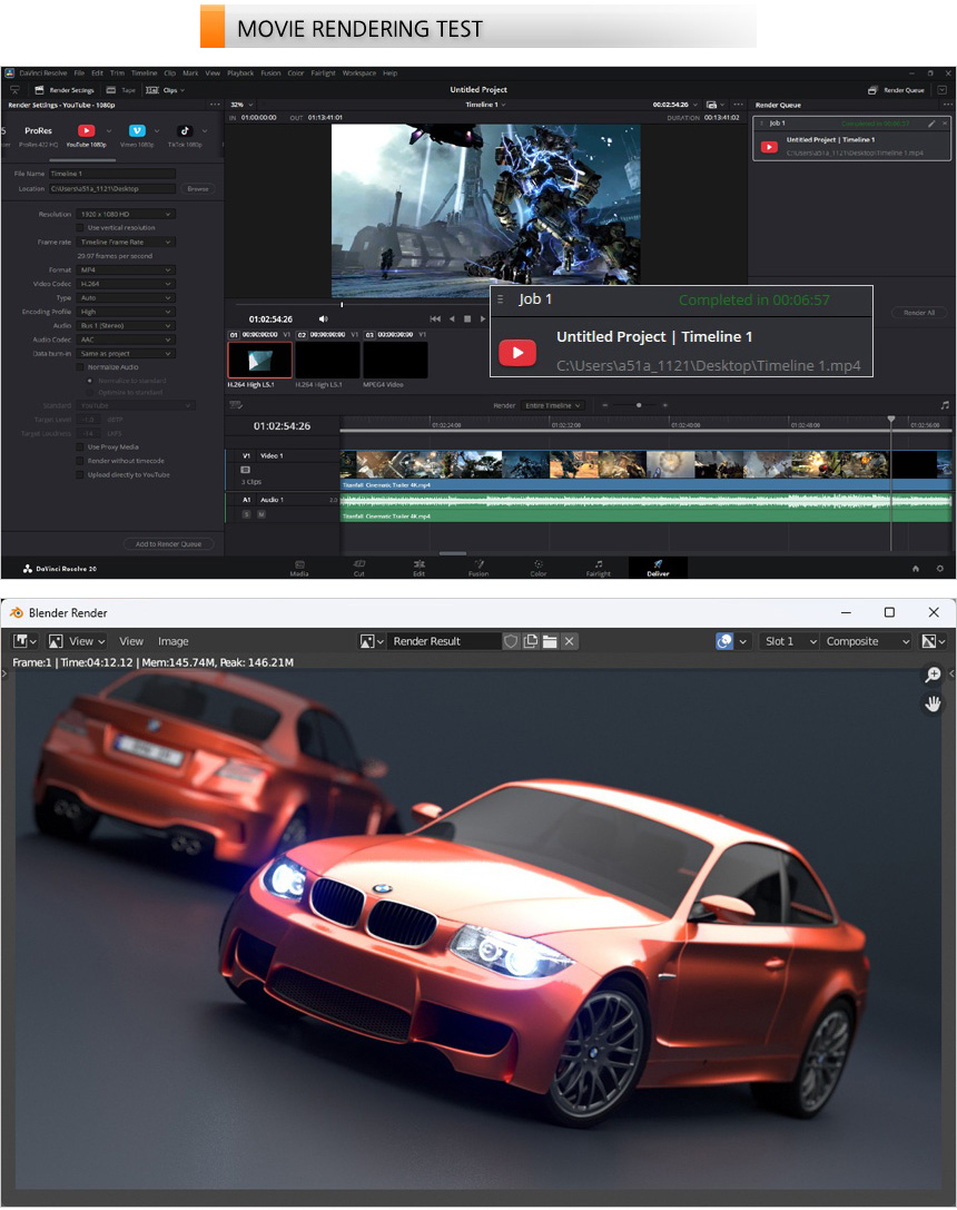 영상편집 S/W 다빈치 리졸브를 이용해 랜더링 테스트를 진행하고 있는 모습으로 (640MB, 920MB, 990MB 4K 동영상을 단일 동영상으로 랜더링, FHD 해상도에 H.264 비디오 코덱) 6분 57초가 소요되는 것을 확인할 수 있었으며 블랜더 랜더링 테스트에서는 4분대의 빠른 랜더링 시간을 보여주었다. @ 기대이상의 빠른 랜더링 속도가 인상적이었다. 영상편집용으로 충분히 사용할 수 있을 것이다.