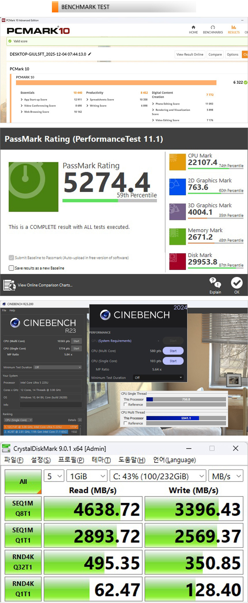 벤치마크 프로그램을 이용해 기기의 성능을 확인하고 있는 모습으로 대부분의 작업을 부드럽게 실행할 수 있는 높은 스코어를 보여주었다. 고성능으로 작동해야 하는 S/W를 부드럽게 사용할 수 있으며 멀티테스킹도 원할하게 실행할 수 있을 것이다. @ 인텔코어 울트라 5 125H 와 대동소이한 성능을 보여주었다.