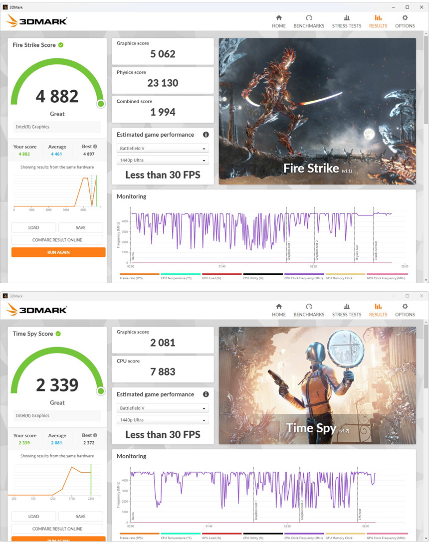 3DMARK를 이용해 3D 퍼포먼스를 확인하고 있는 모습으로 캐주얼한 게임정도는 여유롭게 플레이 할 수 있는 스코어를 보여주었다.