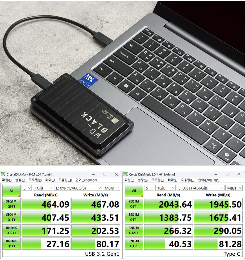 USB 단자의 속도를 확인하고 있는 모습으로 (테스트는 USB 3.2 Gen2x2 지원 외장 SSD를 사용했다.) C타입 단자가 2,000MB/s 이상의 빠른 속도를 보여주었다. 보급형 노트북과는 확연한 차이를 경험할 수 있을 것이다.