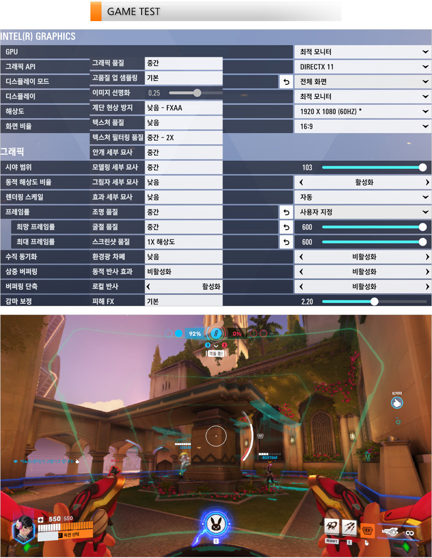 오버워치 2를 이용해 프레임 테스트를 진행하고 있는 모습으로 중간 옵션에서 89-131 프레임을 보여주었다. 부드럽게 게임을 즐길 수 있을 것이다. (단, 처음 게임을 실행하고 10분 정도는 프레임 드랍이 발생했다. 이점 참조 바란다.)