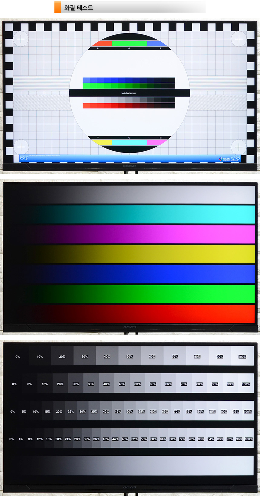 모니터 테스트 프로그램을 이용해 기기의 컬러를 확인하고 있는 모습으로 IPS 모듈 패널 탑재 모델다운 진한 컬러 표현이 인상적이었으며 특정 원색을 과하게 표현해 작업시 스트레스를 주던 일부 IPS 패널과 달리 자연스럽게 원색을 표현하는 것이 대단히 마음에 들었다. (색온도 등을 조절하면 사용자에 맞는 컬러로 셋팅할 수 있다.) 또한 1,000 : 1 의 고정 명암비를 지원하는 일반 IPS 모니터와 달리 1,300:1 의 고정명암비를 지원하며 (그레이스케일 차트를 확연히 구분할 수 있었다.) 5백만대 1의 동적 명암비에 HDR 지원으로 자연스러운 명암의 변화를 경험할 수 있다.
