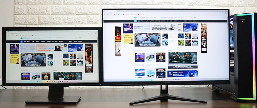 두 대의 모니터를 셋팅한 김에 베젤 두께를 비교해 보았는데 확연한 차이가 발생하는 것을 확인할 수 있었다. 두꺼운 베젤로 인한 거슬림 없이 영상에 몰입할 수 있을 것이다.