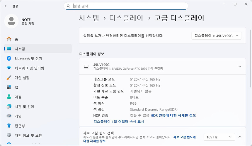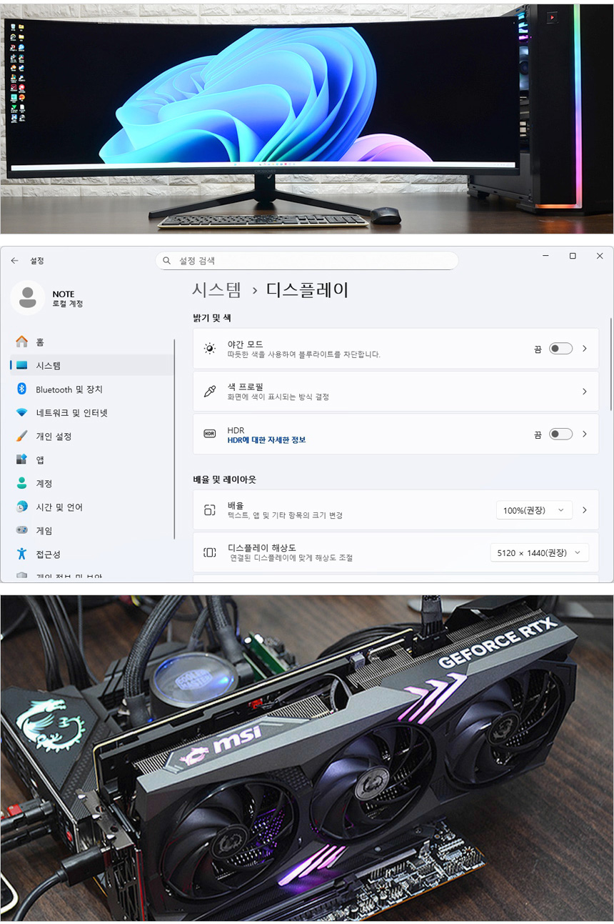 테스트를 위해 모니터를 책상위에 설치한 모습으로 듀얼모니터를 사용한 듯 많은 공간을 차지했다. 좌우폭이 무척 넓기 때문에 모니터 설치전 반드시 여유 공간을 확보해야 하며 디자인 부분에서 강조한 것과 같이 모니터를 세로로 들고 이동해야 한다. (가로로 들거나 패널 부분을 손으로 꽉 쥐면 패널이 파손될 수 있기 때문이다.) @ 이 제품은 DQHD 초고해상도에 165Hz 주사율을 지원해 PC의 높은 성능이 필수적이다. 특히 그래픽카드의 경우 높은 해상도에서도 프레임을 확보할 수 있는 상급 모델을 사용하기 바란다.
