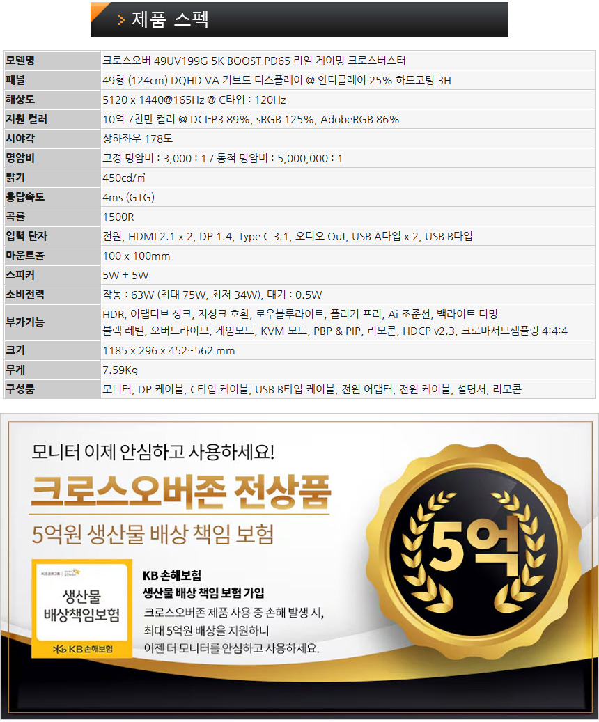 리뷰를 진행하는 크로스오버 49UV199G 5K BOOST PD65 리얼 게이밍 크로스버스터는 파손의 위험이 큰 제품 특성상 반드시 반드시 설명서를 확인하고 제품을 조립하기 바란다. (제품을 스티로폴에서 꺼내지 않은 상태에서 스탠드를 장착해야 한다.) @ 참고로 크로스오버 전상품은 5억원 생산물 배상 책임보험에 가입되어 있다.