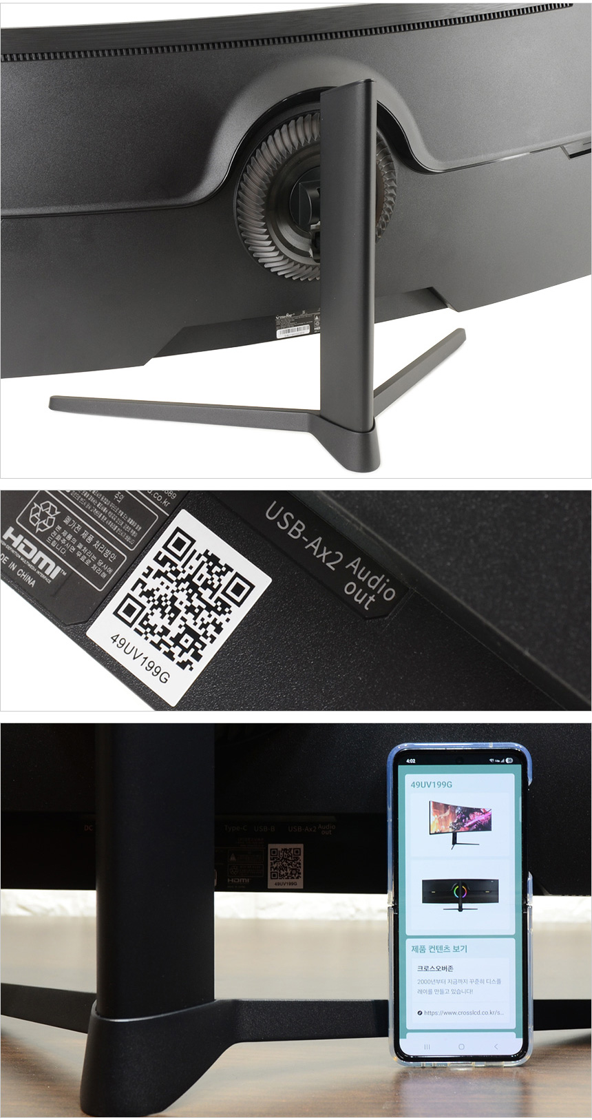멀티 스탠드의 모습으로 바닥면에는 고무패드가 부착되어 미끄러짐을 방지한다. @ 모니터 후면의 QR코드를 스캔하면 제조년월 확인이 가능하며 제품의 상세정보를 손쉽게 확인할 수 있다.