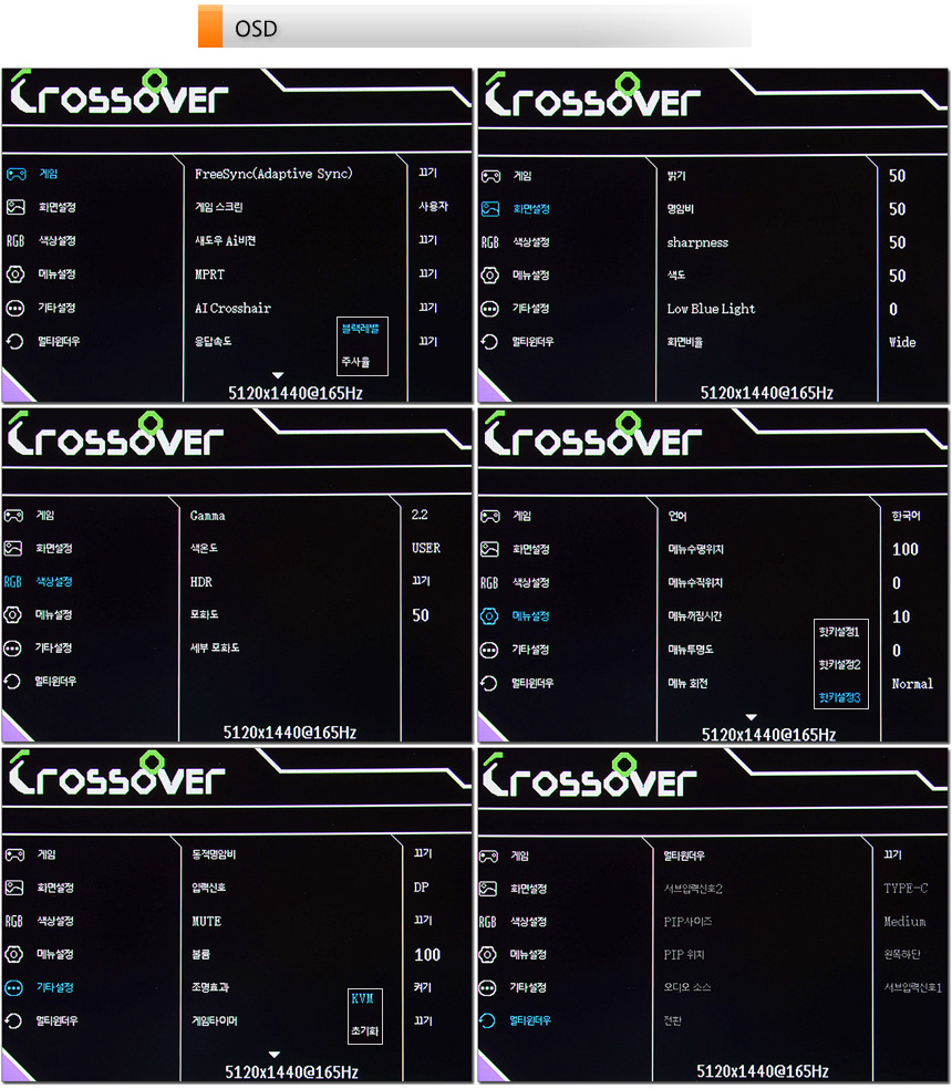 OSD의 모습으로 후면의 조그버튼 뿐만 아니라 리모콘을 사용해 손쉽게 컨트롤 할 수 있다. (참고로 리모콘에서 다양한 핫키를 지원해 입력소스, 조준선, 볼륨, 블루라이트 감소, KVM 등을 빠르게 변경할 수 있다.) 상단의 사진은 OSD 상세설정의 모습으로 밝기나 명암 설정이 가능하며 다양한 화면설정 기능이 제공된다. 또한 멀티윈도우 설정이 가능하며 KVM과 새도우 Ai비전, HDR 설정을 지원한다.