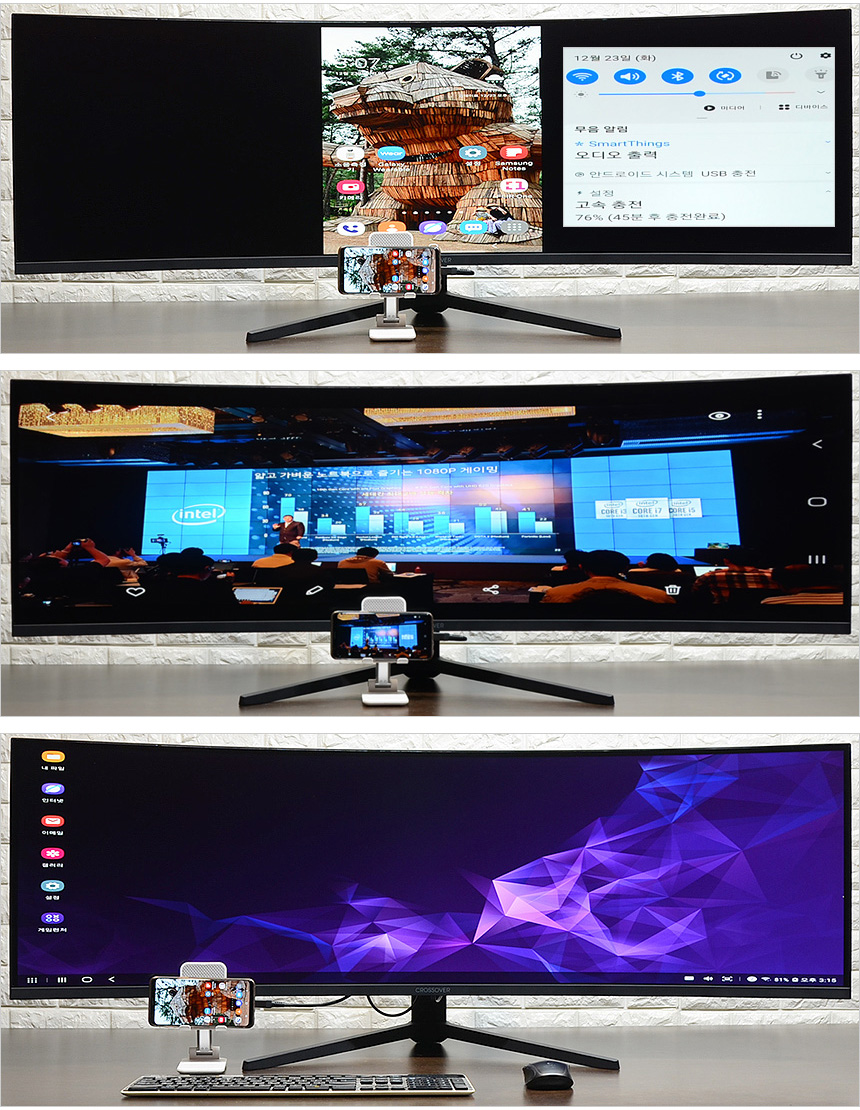 미러링을 지원하는 스마트폰과 연결해 대화면으로 영상을 즐길 수 있다. 상단의 사진은 갤럭시 S9을 연결한 모습으로 스마트폰 화면 그대로 모니터에 재생 되었으며 노트북과 같이 배터리가 충전되는 것을 확인할 수 있었다. (C타입 단자는 스마트폰 고속충전용으로도 활용할 수 있다.) 또한 일반 C타입 모니터와 달리 USB 단자가 설치되어 키보드와 마우스를 연결해 삼성 DEX를 보다 편하게 사용할 수 있다.