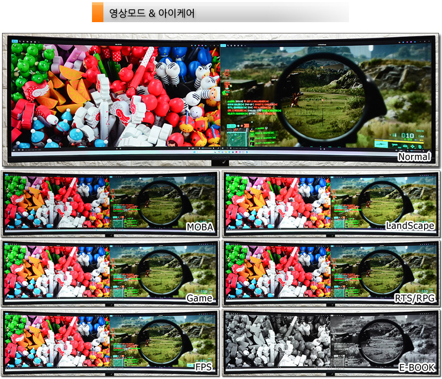 화면모드를 비교한 모습으로 밝기와 명암등에서 차이가 발생하는 것을 확인할 수 있었다. 평소에서는 일반 모드를 사용하다가 작업이나 게임을 할 경우 그에 맞는 모드로 변경해 컨텐츠에 맞는 최상의 영상을 즐길 수 있다.