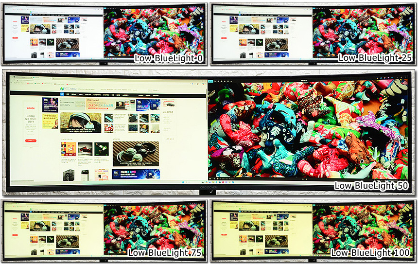 청색광으로부터 눈을 보호할 수 있는 블루라이트 감소 기능을 지원한다. 상단의 사진은 블루라이트의 감소 기능을 테스트 하고 있는 모습으로 설정값에 따라 분명한 차이가 발생하는 것을 확인할 수 있다. (게임이나 동영상 감상 보다는 흰색 배경에서 작업이 이루어지는 웹서핑이나 오피스 등에서 사용하기 바란다.)