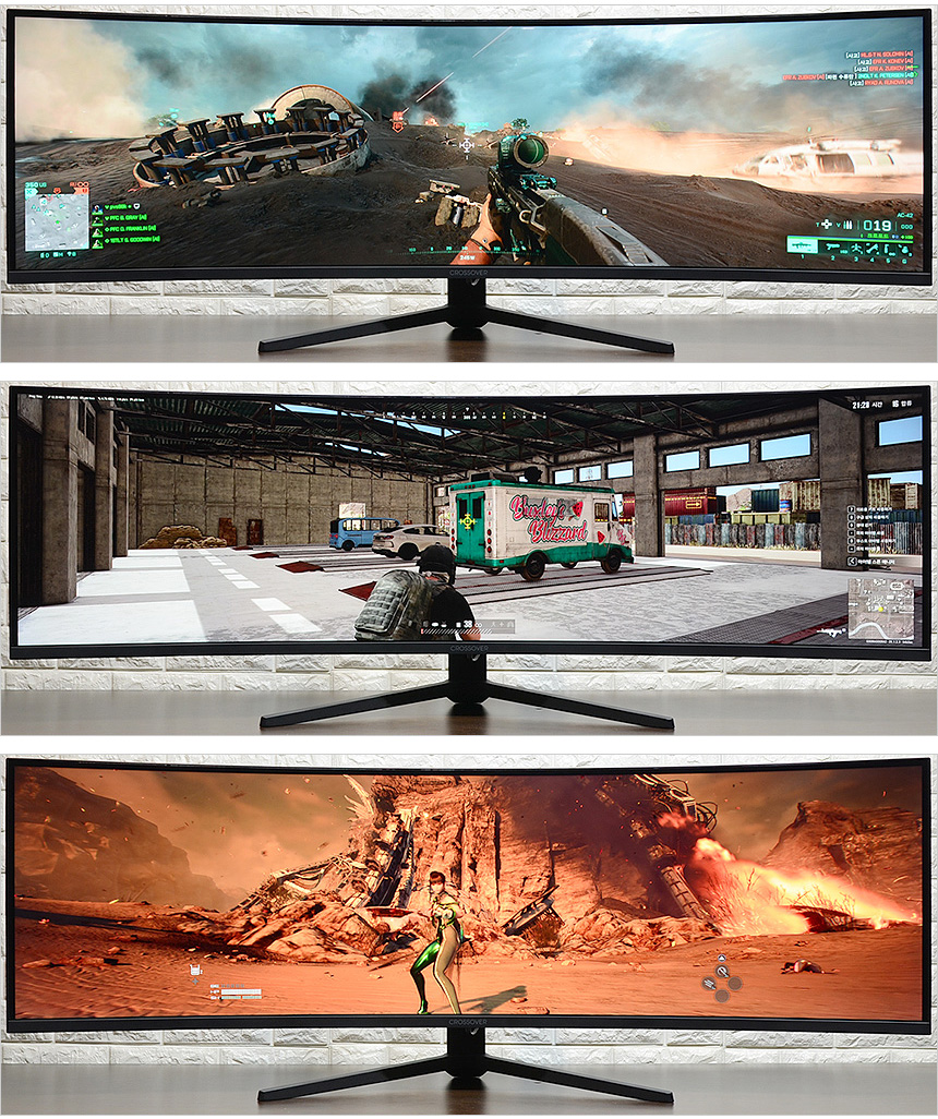 슈퍼 울트라 와이드 비율을 지원해 축구나 레이싱 게임에서 광할한 영상을 한눈에 확인할 수 있으며 배틀그라운드와 같은 FPS 게임에서도 탁 트인 시야로 한눈에 전장 상황을 파악할 수 있다. 뿐만 아니라 게임을 즐기면서 웹서핑이나 기타 작업을 병행할 수 있다.
