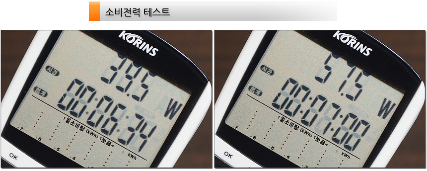 소비전력 테스트를 진행하고 있는 모습으로 밝기 50%에서 39.5W, 밝기 100%에서 57.5W로 작동하는 것을 확인할 수 있었다. (기본 밝기가 상당히 높은 제품으로 50% 로 설정해도 사용에 불편이 없었다. 전기세 걱정없이 사용할 수 있는 모델이다.)