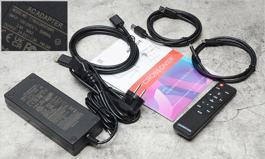 액세서리의 모습으로 사용 설명서를 비롯해 168W 전원 어댑터와 전원 케이블, DP 케이블, C타입 케이블, B타입 케이블 이 제공되며 리모콘이 포함되어 손쉽게 모니터 기능을 조정할 수 있다.