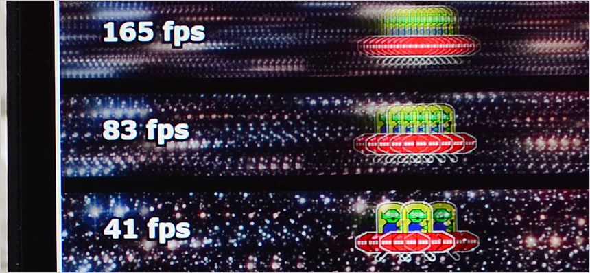 165Hz 주사율을 지원해 FPS 게임도 부드럽게 즐길 수 있다. 상단의 사진은 165Hz 주사율을 쉽게 확인할 수 있도록 하위 프레임과 같이 재생되는 영상 (960 Pixel Per Sec) 을 셔터스피드 1/20 로 촬영한 모습으로 프레임이 낮을수록 캐릭터의 수가 적으며 프레임이 높아질수록 시간당 많은 화면이 뿌려지기 때문에 캐릭터의 수가 많은 것을 확인할 수 있다.