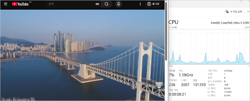 유튜브 고화질 동영상을 이용해 CPU 점유율을 테스트 하고 있는 모습으로 (2160P@60FPS) 7-15% 대의 점유율을 보여 주었으며 인터넷을 실행했을 때 40% 후반까지 점유율이 올라가는 것을 확인할 수 있었다.