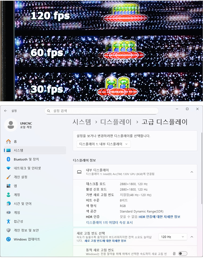 120Hz 주사율 지원으로 물 흐르듯 부드러운 영상을 즐길 수 있다. 상단의 사진은 120Hz 주사율을 쉽게 인지할 수 있도록 하위 프레임과 같이 재생되는 영상 (960 Pixel Per Sec) 을 셔터스피드 1/20 로 촬영한 모습으로 프레임이 낮을수록 캐릭터의 수가 적으며 프레임이 높아질수록 시간당 많은 화면이 뿌려지기 때문에 캐릭터의 수가 많은 것을 확인할 수 있다. (영상에 맞게 주사율을 조정하는 가변주사율을 적용해 불필요한 배터리 소모를 최소화 할 수 있다.)