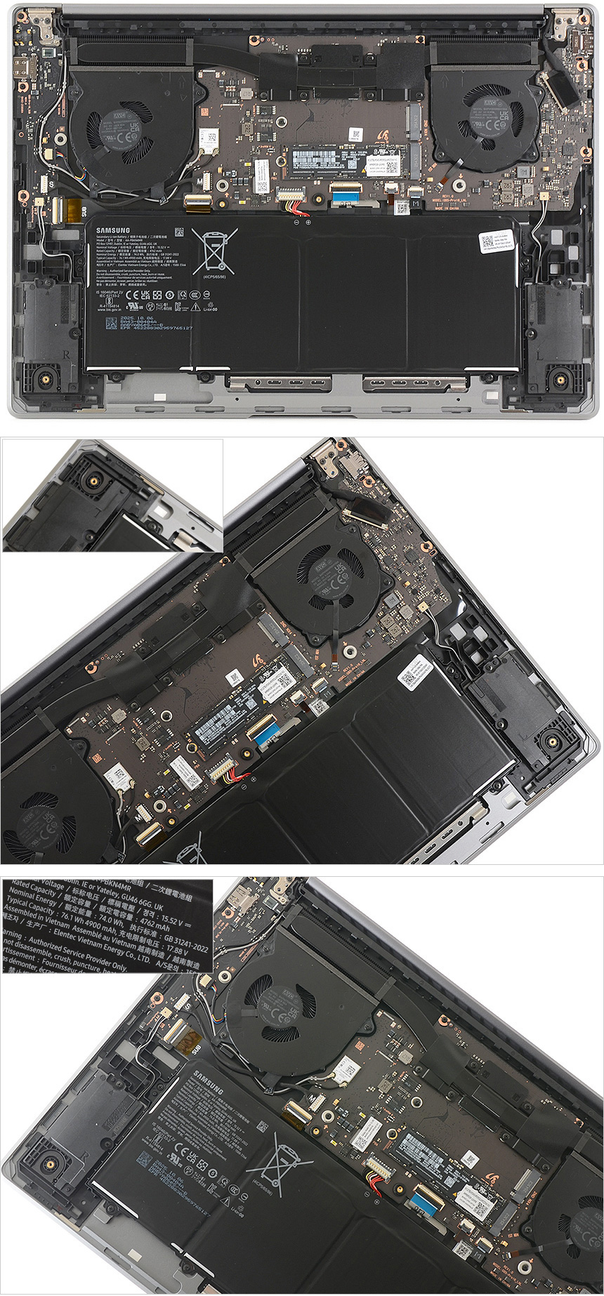 노트북 내부의 모습으로 안정성을 높이기 위해 듀얼팬이 설치되어 있고 하단에는 76.1Wh (4900mAh) 리튬이온 배터리가 설치되어 있고 마그네틱과 스피커가 장착된 것도 알 수 있다. 또한 16GB 대용량 LPDDR5x 메모리가 장착되어 있고 PCIe 4.0 기반의 256GB NVMe SSD 등이 설치되어 빠른 데이터 전송속도를 경험할 수 있을 뿐만 아니라 여분의 M.2 슬롯 지원으로 여유롭게 데이터를 저장할 수 있다. 최신 모델답게 인텔 Wi-Fi 7 무선랜을 지원해 고속 무선속도를 즐길 수 있으며 블루투스 무선연결이 가능하다.