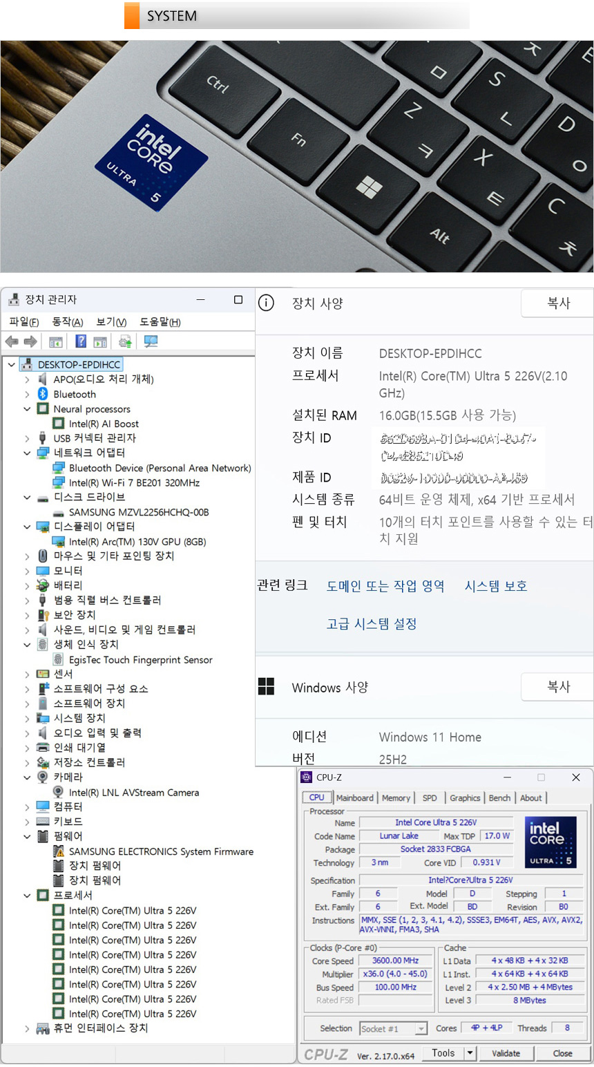 시스템 정보를 확인하고 있는 모습으로 최대 40 TOPS를 지원하는 NPU를 기본 탑재해 다양한 AI 관련 프로그램을 빠르게 실행할 수 있는 인텔코어 울트라 5 226V 프로세서가 탑재된 것을 확인할 수 있다. 뿐만 아니라 아크 130V 내장그래픽을 지원해 캐주얼한 온라인 게임등을 부드럽게 플레이 할 수 있다.