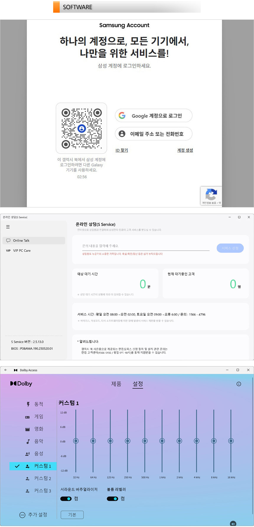 지원하는 앱중 일부는 삼성 계정을 등록해야 사용이 가능하다. 삼성 갤럭시북은 사용자의 불편을 최소화 하기 위해 삼성 어카운트에서 QR코드 로그인을 제공하며 삼성 디바이스 케어를 통해 노트북을 손쉽게 관리할 수 있다. 뿐만 아니라 온라인 상담을 지원해 노트북에 문제가 발생했을 때 빠르게 조치를 받을 수 있으며 돌비 애트모스 지원으로 사용자에 맞는 최적의 음색을 설정할 수 있다.