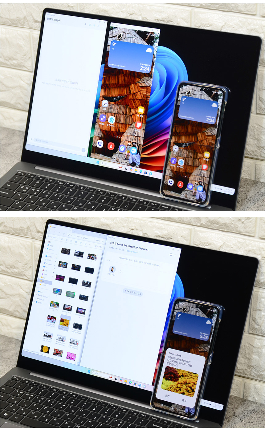 삼성 플로우를 사용하면 노트북에서 스마트폰을 컨트롤 할 수 있으며 무선으로 스마트폰과 간단하게 사진이나 영상, 파일을 전송할 수 있는 Quick Share를 지원해 유용하게 활용할 수 있다. 뿐만 아니라 태블릿과 연결해 화면을 공유할 수 있는 Second Screen을 통해 작업 효율성을 높일 수 있다.