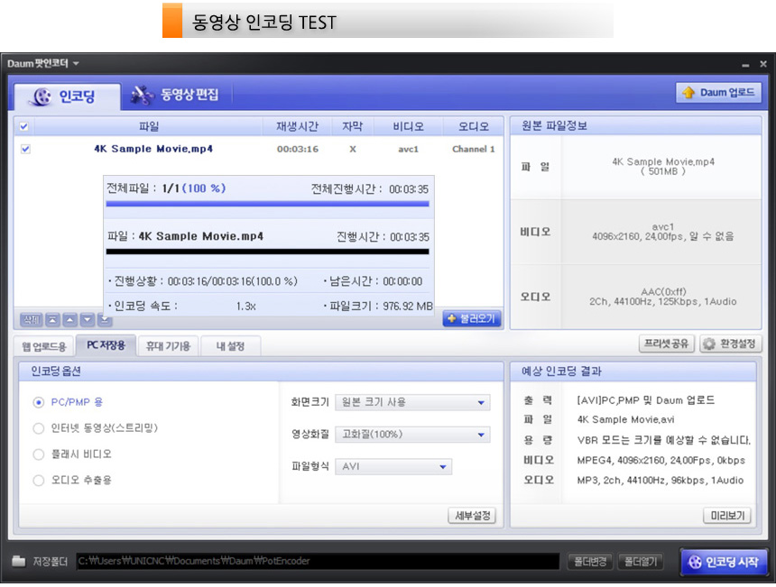 다음 팟인코더를 이용해 4K 동영상의 인코딩을 진행하고 있는 모습으로 3분 35초의 인코딩 시간을 보여주었다.