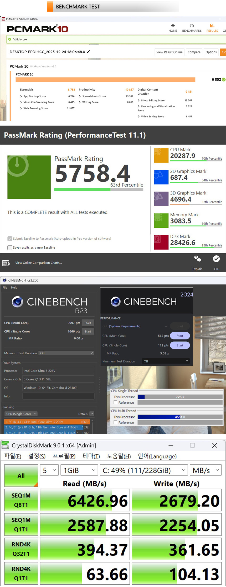 벤치마크 테스트를 진행하고 있는 모습으로 문서작업 뿐만 아니라 고성능을 필요로 하는 전문작업용 S/W도 부드럽게 실행할 수 있는 스코어를 보여주었다. 게이밍이나 크리에이터 노트북 수준은 아니지만 성능으로 인한 스트레스 없이 사용할 수 있을 것이다. 또한 저장장치의 속도를 확인해 보았는데 PCIe 4.0 NVMe SSD를 탑재해 일반 노트북과 확연히 비교되는 빠른 속도를 경험할 수 있다. (단, 용량이 256GB 이기 때문에 추가 장착이나 업그레이드가 필요하다.)