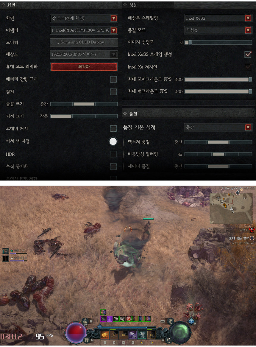 디아블로 4를 WUXGA 해상도에서 중간 옵션으로 실행하고 있는 모습으로 인텔 XeSS (고성능) 기술을 활성화 했을 때 91-112 프레임을 보여주어 부드럽게 게임을 즐길 수 있었다. 충분히 게이밍 용도로 활용할 수 있을 것이다. (프레임 생성 기능이 활성화 되어 예전대비 프레임이 높아졌다.)