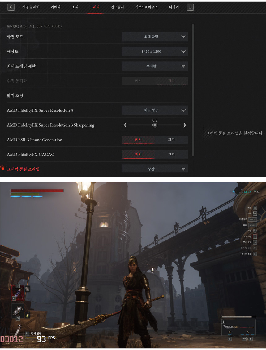 국산게임 P의 거짓을 중간 옵션에서 플레이 하고 있는 모습으로 FSR3를 최고 성능으로 설정했을 때 74-98 프레임을 보여주어 불편없이 게임을 즐길 수 있었다.