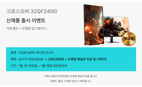 다양한 온라인 마켓에서 1월 1일(목) ~ 1월 18일(일)까지 진행되는 이번 출시기념 행사에서 크로스오버 32QF240G Fast IPS 400 게이밍 멀티스탠드 모니터는 상시가 359,000원에서 20,000원 할인된 339,000원에 판매된다.