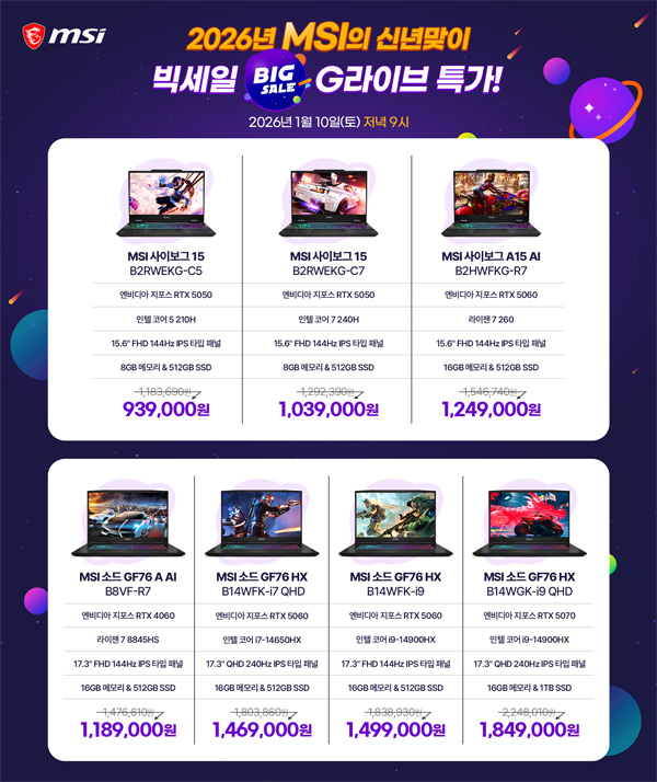 특히 MSI 베스트셀러 모델인 소드 GF76 A AI는 메모리 및 SSD 가격 상승으로 노트북 시장 전반의 가격 부담이 커진 상황 속에서, 마지막 재고 한정 클리어런스 세일로 진행돼 이번 라이브 방송에서만 만나볼 수 있는 놓칠 수 없는 구매 기회로 주목된다.