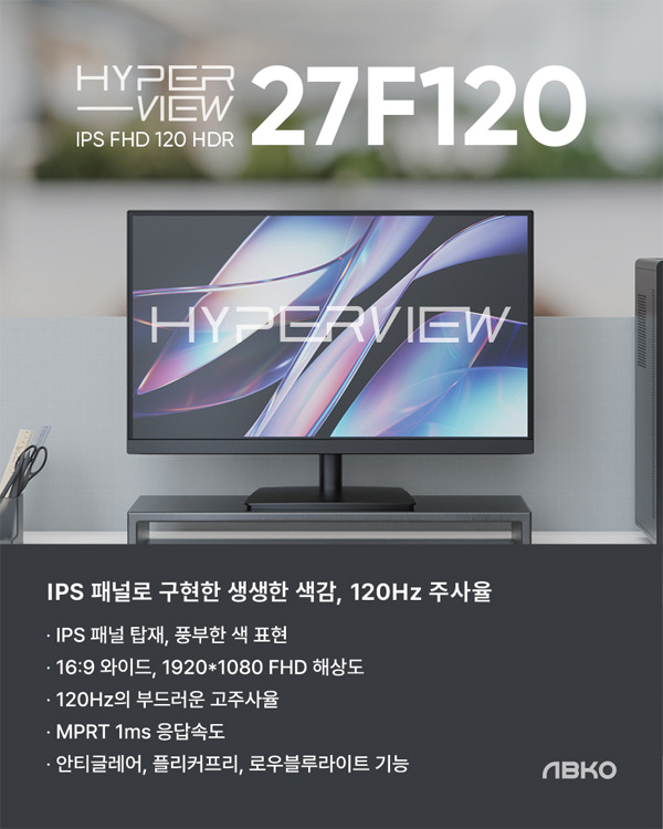 앱코에서 IPS 패널 탑재, 120Hz의 FHD 모니터 ‘앱코 하이퍼뷰 27F120 IPS FHD 120 HDR’ (이하 ‘하이퍼뷰 27F120’)을 출시했다.