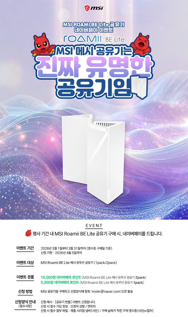 MSI는 MSI의 메시 유무선 공유기 MSI Roamii BE Lite를 구매한 고객을 대상으로 간단한 구매 인증만으로 네이버페이 포인트를 제공하는 프로모션을 진행한다고 밝혔다.